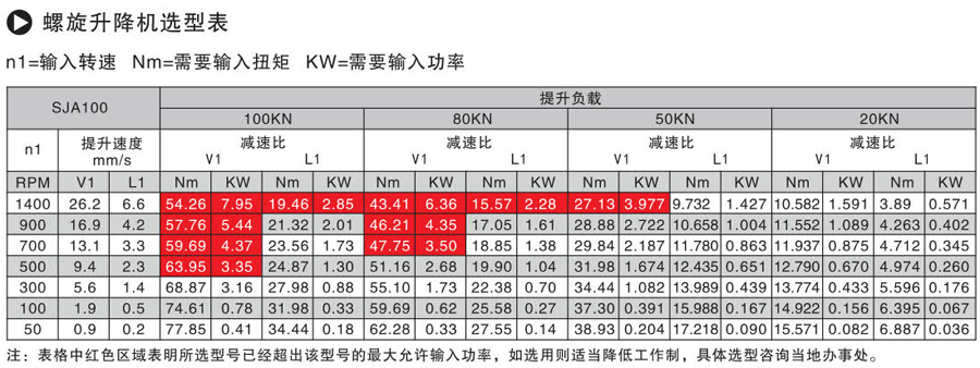 螺旋升降機正常工作狀態下的輸入功率不能超過最大輸入功率,輸入功率kw=(滿載扭矩Nm x負載率x輸入轉速rpm )/ 9550m,